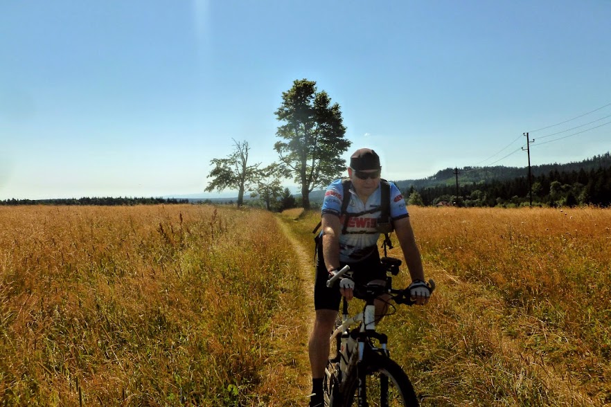 Po tym cudnym odpoczynku czeka nas kolejny podjazd - ciężki, bo w większości odsłonięty - do Pstrążnej. Jakimś cudem go podjeżdżamy i już za chwile dwie lądujemy w Czechach. Od tego miejsca nie wiem gdzie jestem, jadę w ciemno za Przewodnikiem-Ryjkiem, Feniks również mu ufa więc zwiedzamy Czechy polami, lasami, łąkami, szosą. Jak tylko się da. Co i rusz czekają nas małe "bonusy" w postaci kamiennych grzybów, z których widoki zapierały dech w piersi, w postaci podjazdu-niespodzianki w Hlavňovie do Hvězdy, gdzie czeka na nas restauracja i kolejne przepiękne widoki na góry. Podczas zjazdu zaliczamy z Feniksem nowe rekordy szybkości. Chyba w tym momencie przestanę igrać ze śmiercią i nie będę próbowała tego rekordu pobijać :) Niedługo później rozstajemy się w Jetřichovie; chłopaki jadą w prawo na Broumov i dalej do domu, ja w lewo na Mieroszów. Droga powrotna, mimo że w samotności już i z niemałymi oznakami zmęczenia, idzie mi bardzo sprawnie i przyjemnie. Do domu docieram o 22:00.